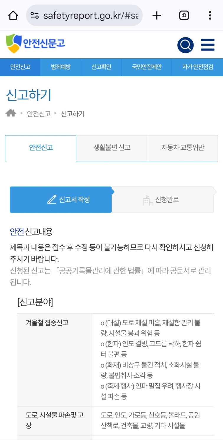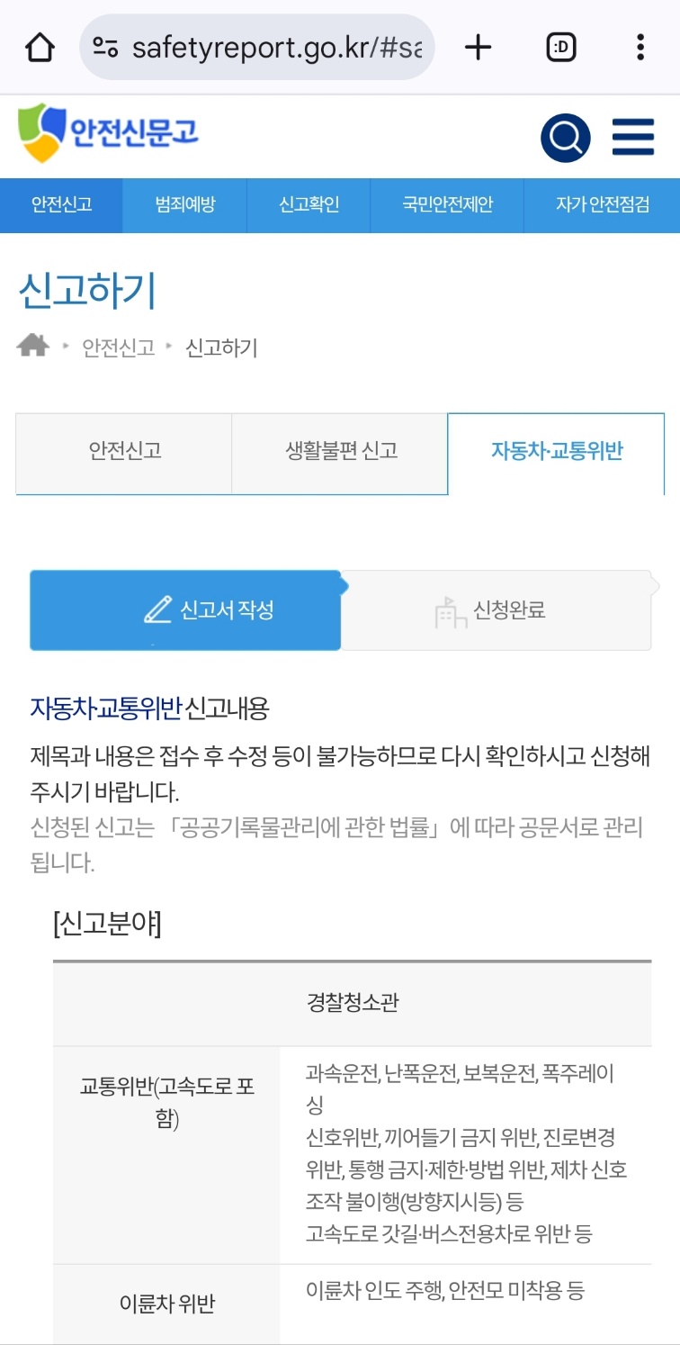 안전신고를 누르고 들어가시면 안전신고로 돼있는데