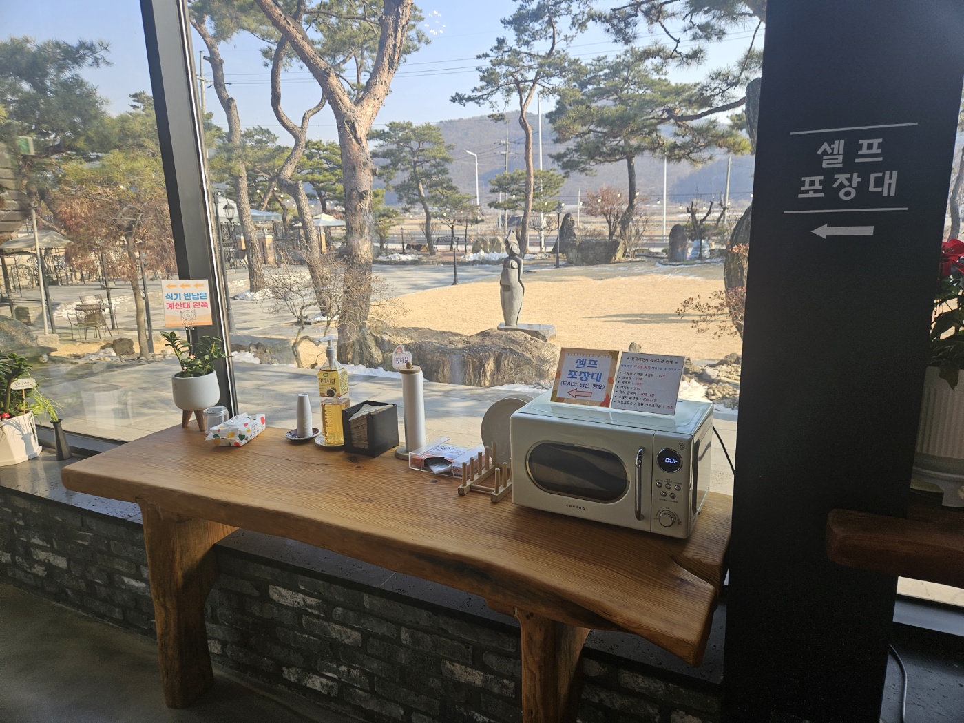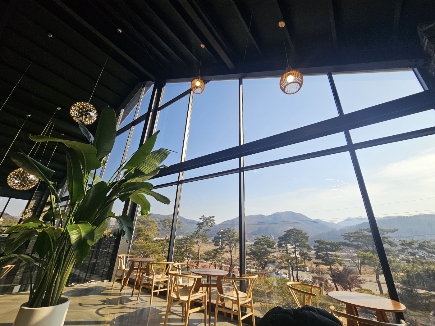 2층에서 창 밖 산을 보며 커피를 마시면 2배로 맛있어진다.