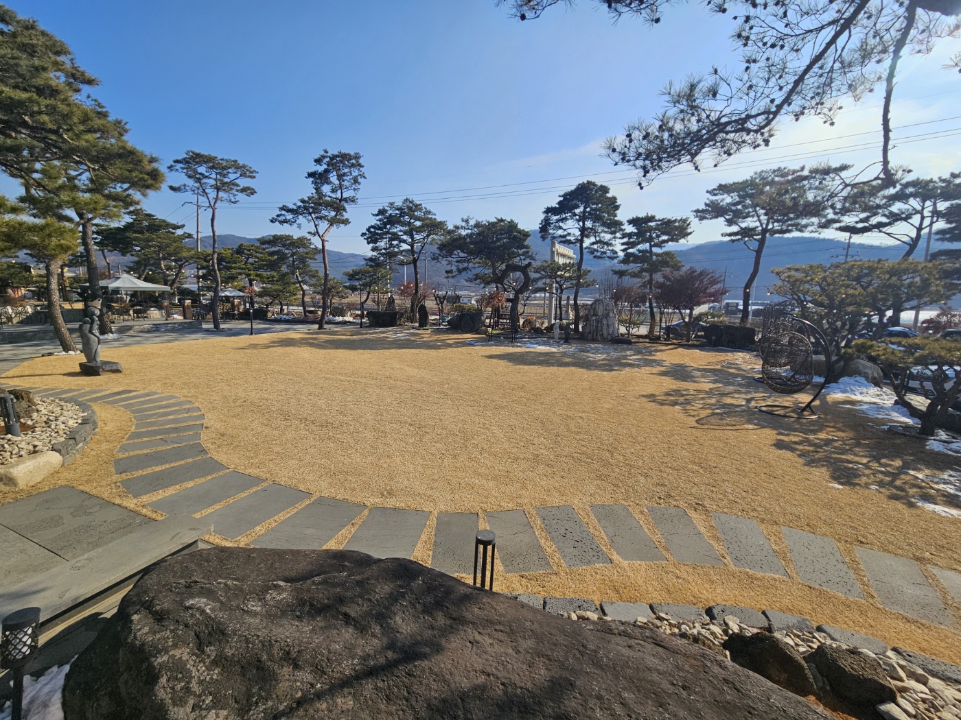 넓은 공간과 이쁘게 자리 잡은 소나무가 보기 좋은 정원을 만들었네요.